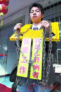 “我是乙肝病者,我要工作”,2月13日上午,廣州南方人才市場附近,來自江西的大學生羅思文眉頭緊皺地戴著自制的紙“枷鎖”,透過掛在胸前的標語,發出那痛徹心扉的無聲吶喊。此前,羅思文費盡千辛萬苦通過了一家用人單位的考核,卻因為“大三陽”而被拒之門外。