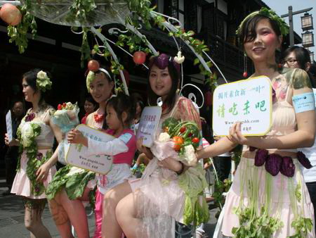 當(dāng)天正值第四十個(gè)世界地球日,成都文殊坊街上人流熙攘。這幫身披菜葉的年輕漂亮女子馬上就成為行人注目的焦點(diǎn),“喲,遠(yuǎn)看就只掛了些菜葉子在身上,原來(lái)還是穿了點(diǎn)紗的嘛,是不是又在搞什么商業(yè)活動(dòng)哦?”四川新聞網(wǎng)記者在現(xiàn)場(chǎng)看到,雖然沒(méi)怎么搞清楚狀況,但不少市民已經(jīng)掏出手機(jī)來(lái)開(kāi)始拍照。得知是群素食主義者的宣傳活動(dòng)后不少市民都打趣稱(chēng),“用穿得少的美女上街當(dāng)噱頭,肯定要轟動(dòng)。”