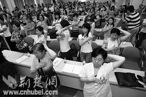 “乳房疾病很煩惱,自我檢查很重要,先舉手,后叉腰,對著鏡子仔細瞧……”昨天,一群女性在同濟醫院醫生帶領下,吟誦《乳房自查口訣》,做瑜伽操。
