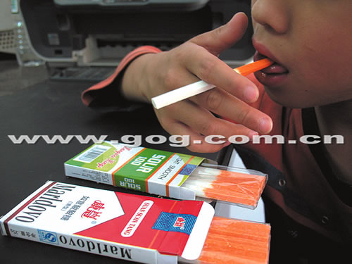 據家住安順市中華東路的劉女士講,他的兒子今年8歲,讀小學二年級。昨日上午,她看到兒子與三個小朋友在院子里玩時,突然發現他們每人手里都夾了一支香煙,不停地送到嘴里。劉女士見了,氣得幾步走到兒子的身旁,正要伸手教訓兒子時,才發現這不是香煙,而是仿照香煙形狀的酸酸糖。兒子告訴劉女士,這些糖是他在附近的一個小攤子上用5角錢一包買來的,兒子還說,這種糖在他們學校附近也有賣,因為像香煙,大家都覺得好玩,好多男同學都在買,而且有的同學買來后,就像大人給別人敬煙一樣“敬”給關系好的同學“抽”。
