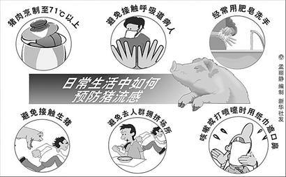 避免接觸流感樣癥狀(發(fā)熱,咳嗽,流涕等)或肺炎等呼吸道病人;注意個(gè)人衛(wèi)生,經(jīng)常使用肥皂和清水洗手,尤其在咳嗽或打噴嚏后;避免接觸生豬或前往有豬的場所;避免前往人群擁擠場所;咳嗽或打噴嚏時(shí)用紙巾遮住口鼻,然后將紙巾丟進(jìn)垃圾桶;如在境外出現(xiàn)流感樣癥狀(發(fā)熱,咳嗽,流涕等),應(yīng)立即就醫(yī)(就醫(yī)時(shí)應(yīng)戴口罩),并向當(dāng)?shù)毓残l(wèi)生機(jī)構(gòu)和檢驗(yàn)檢疫部門說明。