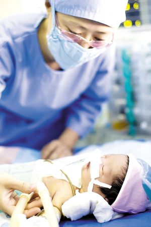 中秋節前添了個小寶貝,全家人都很高興。然而秋秋出生后沒多久,中心婦產科新生兒科的醫生們就發現孩子的嘴唇以及全身上下都開始發紫,而且越來越厲害。于是,中心婦產科醫院立即借助和胸科醫院的合作關系,請來胸科醫院的醫生為秋秋作B超檢查,發現秋秋屬于紫紺型先天性心臟病,原本應該連接左心室的主動脈移位,必須盡快進行“修心”手術,否則左心室便會萎縮、喪失正常功能,會有生命危險。這突如其來的打擊讓秋秋的父母痛不欲生,但小兩口仍然堅信自己的孩子一定能挺過這道難關,他們無論如何也要給孩子看好病。