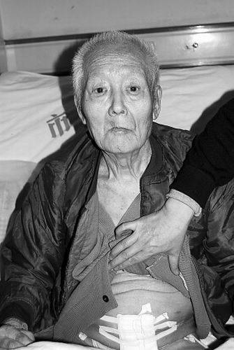 1月4日,記者在醫院病房內見到了82歲的于文或老人,他正痛苦地坐在病床上,肚子上纏著厚厚的醫用紗布,手臂上正在輸液。隨后,老人的兒子于先生拿出了斷針的注射器,上面又安裝了一個新針頭。記者看到,新安裝的針頭很短也很細,有1厘米長。于先生說,他們家人心情很糟糕,明知老人在遭受痛苦卻無能為力。