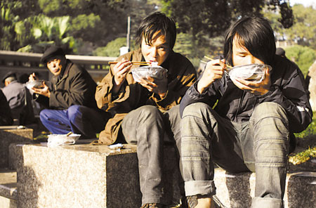 在紅日亭施粥攤前, 領到粥的人在津津有味地吃粥