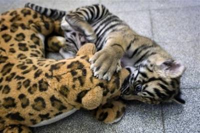 據臺灣東森新聞網報道,活蹦亂跳的小老虎不但會和小孩一起玩,還會把玩具豹玩得不亦樂乎。不過,可別看它一副自得其樂的樣子,其實小老虎有著非常可憐的身世,因為出生才十天的它,就不幸地被自己的親生母親拋棄。