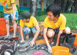 屏東災區皮膚病、蜂窩性組織炎患者激增,志愿者幫忙災戶清污后,用消毒水與肥皂刷洗雨鞋,避免感染。