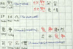 一名今年小六畢業的圣嬰小學學生的華文筆記簿,這名學生抄下老師針對華文生詞提供的英文解說。(聯合早報 圖)
