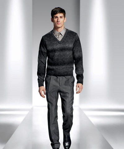 服裝的整體線條幾乎全都著墨于窄版、短身、合腰。而暗面布料如法蘭絨、羔羊毛、英國雪特蘭短羊毛、軋別丁斜紋防水布及粗氈羊毛,與亮面科技材質(zhì)如尼龍、絲、緞相互搭配,展現(xiàn)出強烈的視覺對比,富有華麗的時尚輪廓。色彩運用最受男士們歡迎的黑、灰、深藍、橄欖綠及咖啡色為基調(diào),點綴以亮紅、軍綠色,再度以反差色系突顯搶眼的風格;而金屬材質(zhì)適時加入,更具畫龍點睛的效果。