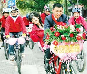 12月7日,一支自行車迎親隊伍穿行在金華市區主要街道,50多位單車車友為新郎新娘舉行了特殊的自行車婚禮。據介紹,新郎名叫盧正操,是金華第十五中學的美術教師、單車愛好者,新娘朱亞郎是江山市的一位教師。通訊員 葛躍進 攝