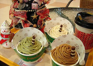 臺灣商家推出圣誕限定“蒙布朗系列甜甜圈”,共有三種口味,包括抹茶蒙布朗、栗子蒙布朗以及焦糖蒙布朗甜甜圈。首度采用杯裝的甜甜圈,以具有濃郁巧克力風味的巧芙甜甜圈為基底。