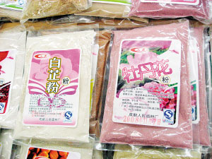 些敷臉的粉末不在護膚品分類中出現,而是在超市的面粉區域銷售,也有近百種之多,將水果、蔬菜以及堅果的提取物同面粉結合,這樣的粉可以用溫水調和,用小火或微波爐煮制食用,也可以加蛋清或蜂蜜敷臉,其實喜歡DIY面膜的女士們一定知道,用蛋黃混合面粉而成的面膜薄薄地涂在臉上,可滋潤皮膚。只不過現在我們食用的面粉可以用這些特殊的面粉代替了,會有更多的功效在里面,比如美白、抗敏、排毒等功效。可選擇的有杏仁粉、枸杞粉、玫瑰花粉、苦瓜粉、淮山粉、薏仁粉、檸檬粉、蘆薈粉、白芷粉、紅豆粉、綠豆粉、杜鵑花粉、黑木耳粉、荷葉粉等等。70克一小袋兒要花費近17元,顯然敷臉比食用更劃算些。(文/攝 孫小雅)