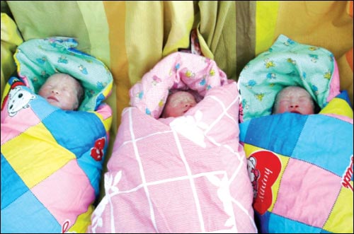 由于家里經濟困難,這次直到懷孕5個月時,童芳才在丈夫的陪同下到醫院做B超檢查,發現懷的竟是三胞胎。“當時我又開心又擔心,開心的是竟然一次懷了三個,擔心的是怕三個全是女兒!蓖继寡。