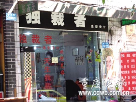 陳小姐所說的理發店位于渝中區七星崗和平路,是家面積約6平方米的小店,黑色招牌上,“獨裁者”三個白色大字特別顯眼。小店玻璃門上寫著“獨具匠心,天生我裁”。