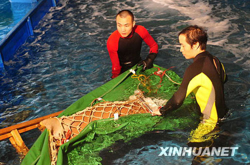 當日晚,廣東省漁政部門從廣州一家酒樓解救出一條護士鯊,并將其送到廣東省水生野生動物救護基地。據悉,此護士鯊為廣州某酒樓從水產市場購得,在酒樓水族箱里展示,接受食客們的預定。環保人士獲知后前往酒樓抗議護鯊,漁政部門隨即前往酒樓將其救出。護士鯊屬于廣東省野生保護動物,受到廣東地方保護法保護。新華社記者 盧漢欣 攝