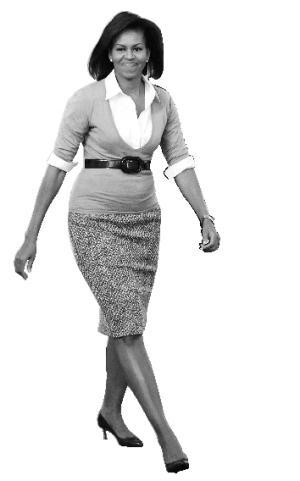 米歇爾的形象每天都有變化,這讓她與喜歡褲裝套服的勞拉·布什和希拉里·克林頓形成鮮明對比。米歇爾會重復穿同樣的衣服,不過會配上新飾品,這也是普通女性的做法。