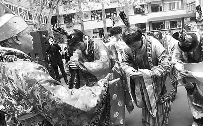 下午2點,幽幽的古樂響起,著漢服的數(shù)位老人和18位青少年再現(xiàn)古時成人禮。“請行冠禮,”在洪亮聲音下,長者們?yōu)榍嗄甏鳌肮凇辈⒄矶苏?8位青年向父母行大禮,感謝養(yǎng)育,再向師長行大禮,感謝教育。據(jù)了解,成人禮自周代就有,當時稱為“冠笄之禮”,男孩行“冠禮”,女孩則行“笄禮”。60歲老者羅世明穿著漢服下臺來,他是行禮的長者,“現(xiàn)在年輕人似乎已忘了傳統(tǒng)道德和禮儀,希望他們從國學文化中重新了解中國傳統(tǒng)文化,端正自己。”