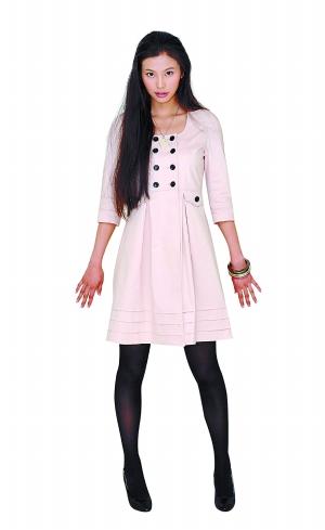 珍珠粉是今年的流行色,非常適合春天這個季節,這件衣服的面料比較厚,又適合在有點涼的時候穿。這個款式簡單又甜美,非常適合OL和具有可愛氣質的女性穿著。發型最好搭配比較自然的披肩發。
