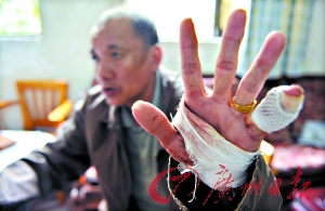 除了手被砍傷以外,洪叔的腰部也被劃傷,走路時一瘸一拐。回憶前晚發生的事情,洪叔和美姨都很后怕。洪叔說,當晚8點50分,美姨到洗手間沖涼,廳里只剩下他一人。十分鐘后,洪叔突然看到兩個身影閃進院內,還沒有等他反應過來,一名男子捂住他的嘴巴,拿著西瓜刀說,“不要動,再動就捅死你!”另外一名男子則在屋內到處翻找,洪叔拼命地掙扎反抗。