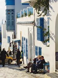 有一幢房屋,綠色的樹(shù)和紅色的花緊貼著白墻生長(zhǎng),只露出藍(lán)色的門窗。我恍惚起來(lái),這不是童話里最迷人的場(chǎng)景嗎?在這樣的場(chǎng)景里,藍(lán)色的門被推開(kāi),走出了童話里的阿拉伯公主,她回眸一笑,然后沿著鵝卵石小街邊的臺(tái)階,一步步地走下去,走到一望無(wú)際的地中海邊。我也沿著臺(tái)階走下幾步,那里是一個(gè)露天咖啡館,坐在木質(zhì)長(zhǎng)椅上,點(diǎn)一杯突尼斯人最愛(ài)喝的薄荷茶,倚著欄桿,面朝大海,不知不覺(jué)間人便沉靜了下來(lái),漸漸地好像融化在純凈的藍(lán)色與白色里。