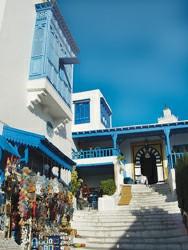 站在小鎮(zhèn)的最高處,才會發(fā)現(xiàn)其實這里地勢險要,真是臨海的峭壁。可正是因為清一色的藍色和白色,消解了所有的陡峭,將一切平和地鋪展開來。聽說這里的房屋之所以選擇白色,主要是出于生活上的考慮,因為地中海沿岸的夏天氣候炎熱,而白色具有不吸熱又容易散熱的特性,因此涂在房屋外墻,可保持室內涼爽,再加上這里盛產(chǎn)石灰,于是選擇白色也就理所當然了。一位突尼斯朋友開玩笑說,在這里只消賣藍色油漆和白色石灰,就能讓生活過得自由自在。事實上,如此讓人驚艷的藍與白的搭配,在地中海沿岸的其他地方并不鮮見,只是突尼斯人對生活的熱愛,對人的天性的格外尊崇,才使得西迪布賽這座“藍白小鎮(zhèn)”成為世上一個獨特的存在。