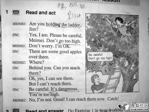 大家去學農(nóng)去摘蘋果,Han Meimei爬在梯子上,Jim就很緊張地在下面喊“Be careful!”(當年的英文教材)