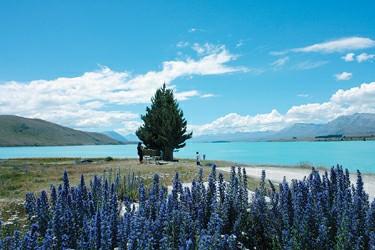 擱下行李我們一直向南而去,尋找皇后鎮(zhèn)南端的人間仙景蒂卡波湖。寂靜的湖面,四周覆蓋著蒼翠的樹(shù)木和盛開(kāi)的魯冰花,加上對(duì)岸雪山倒影,四季美景濃縮一簾。缺水的新西蘭島國(guó)對(duì)湖水的利用可以說(shuō)是費(fèi)煞苦心,海拔700多米的高山湖泊,筑了7條人工導(dǎo)流明渠,不但用以截流灌溉,而且,還在每一出水口修建了水利發(fā)電廠,7座電廠為南島的畜牧農(nóng)漁提供了豐裕的清潔能源。科研人員還在截流湖中試養(yǎng)原本生活在大海里的“三文魚(yú)”。第一次見(jiàn)到在淡水中游弋的“三文魚(yú)”,怎不叫人嘴饞!花上10個(gè)紐幣,我們吃上了活殺生食的淡水“三文魚(yú)”。說(shuō)實(shí)話,這人工飼養(yǎng)的淡水“三文魚(yú)”太肥太油膩,口感和味道遠(yuǎn)差海水“三文魚(yú)”一籌,但我還是由衷感到高興,這畢竟是人類由漁到養(yǎng)的轉(zhuǎn)變,“三文魚(yú)”將永不枯竭。食罷魚(yú)宴,不久,我們的車已駛?cè)肓诵挛魈m著名的南島水果園,紅的櫻桃、粉的水蜜桃、黃的杏子、綠的蛇果,五顏六色的累累碩果,掛得樹(shù)條彎下了腰。為了充分利用水資源,每棵樹(shù)下均有一條微型水管進(jìn)行滴灌,晝夜較大的溫差,明媚陽(yáng)光的輻射和沒(méi)有污染的潔凈空氣,給水果提供了優(yōu)良的生長(zhǎng)環(huán)境,來(lái)到了果園,人人現(xiàn)摘現(xiàn)吃。導(dǎo)游見(jiàn)我從樹(shù)上摘下櫻桃還要在自己T恤上蹭蹭,便告訴我說(shuō),不用蹭,這里的水果很干凈。于是,我扔幾粒入口,原汁原味。