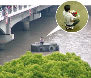 寧波東方熱線、天一論壇5月20日出現多個名為《江廈橋下,上演求愛秀》的帖子,帖子中的照片顯示一男子手捧玫瑰花蹲在江中的防撞墩上。他是怎么下去的?是純粹作秀,還是真情表白?網友發現后趕緊報警,警方調查后得知,該男子為向相戀4個月的女友證明自己是多么愛對方,上演了一出瘋狂之舉。他手捧玫瑰花,單手“橫渡”奉化江,游了40多米后,爬上江心的防撞墩,隨后擺出“思想者”等各種造型(下圖)。