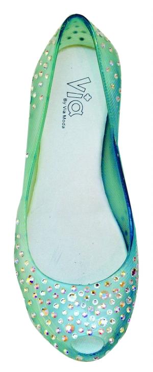 綠色帶水鉆果凍鞋(VIA,798元)夠舒服,夠自然,散布在鞋面上的水鉆就像清新的雨滴。