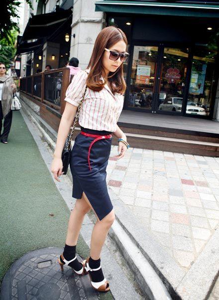 高腰鉛筆裙,一定是今年必買的單品,搭配豎條紋上衣很有80年代小姐的style。