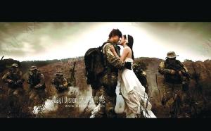 灰暗的天空下,身穿潔白婚紗的新娘與新郎緊緊相擁,但他們倆身后卻是硝煙彌漫的戰(zhàn)場,戰(zhàn)士們?nèi)蔽溲b、手持沖鋒槍,表情嚴肅地往前沖。戰(zhàn)爭婚照,只有80后敢把戰(zhàn)爭、血腥、悲劇和婚紗聯(lián)系在一起。80后生長在網(wǎng)絡(luò)信息時代,他們總能從網(wǎng)上獲取最新的信息,從而向攝影師提出各種各樣的要求。“所以我們也要不斷創(chuàng)新,緊跟著潮流走,才能滿足消費者的需求。”今生有約的經(jīng)理王軍告訴記者。