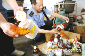記者現(xiàn)場(chǎng)看到,該作坊位于一棟3層民房?jī)?nèi),1樓專門設(shè)計(jì)了一個(gè)狹長(zhǎng)的車庫,打開卷簾門可以直接將貨車倒入房間內(nèi)裝貨,非常隱蔽。3樓除了工人生活房間外,有一間房里堆滿各種包裝紙箱、包裝袋,以及已經(jīng)使用過的各種不明食品添加劑,估計(jì)其中可能有日落黃、檸檬黃等國(guó)家限制使用的色素以及燒堿等。執(zhí)法人員將色素瓶蓋打開,鮮艷的色素很快染紅了執(zhí)法人員的雙手。雷所長(zhǎng)介紹,這些色素具體是什么成分,可否添加入食品,食用后對(duì)人體有無害處還有待技術(shù)檢驗(yàn)。