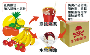 通過現(xiàn)場(chǎng)調(diào)查,執(zhí)法人員將假刨冰和假珍珠奶茶的制作工藝揭開。