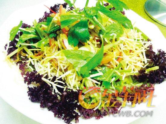 印尼黃姜具有祛濕、清熱解毒、治療動脈硬化的作用,對心血管系統的疾病也有較好的療效。而南姜則可以幫助消化、壯陽,具有振奮、活化肌膚與抗自由基等多重特性。將青瓜、西紅柿、芹菜、洋蔥均切成絲狀后,再加入特制的黃姜、南姜、辣椒(可根據自己的口味)涼拌而成的“絲絲入扣”,辣香清脆,既營養,又養生美容。