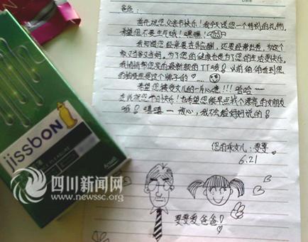 文中這樣寫道:“首先祝您父親節快樂,我今天送您一個特別的禮物,希望您不要生氣哦!知道您經常在外應酬,還要經常出差,為這個家又當爹又當媽。為了您的健康也是為了您的生活更快樂,我悄悄幫您買的最新款的TT哦!以前偷偷看到您的抽屜里是這個牌子的……”言語中,透露出女兒對父親的感激之情。最后,女兒還俏皮的說“希望您接受女兒的一片心意。!哈哈……在此祝您節日快樂!也希望您能早點找個漂亮的女朋友哦,嘻嘻……放心,我不會給媽媽說的!”小女孩通篇用語樸實無華,天真無邪,讀來讓人感動。