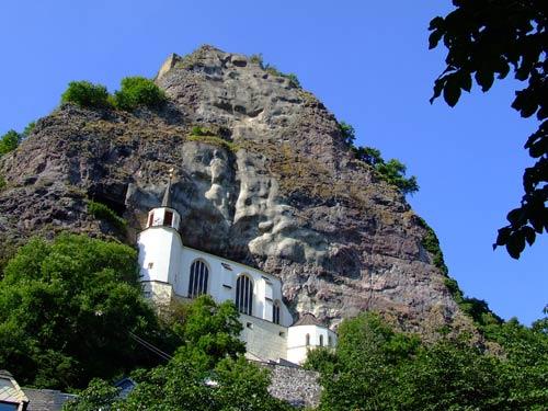 巖石教堂位于德國風(fēng)景優(yōu)美的伊達(dá)爾—奧伯施泰因小鎮(zhèn)旁。這里是德國著名的寶石之鄉(xiāng)。走在小鎮(zhèn)的石板路上,記者老遠(yuǎn)就看到鎮(zhèn)外山上巖石峭壁上的白色小教堂。