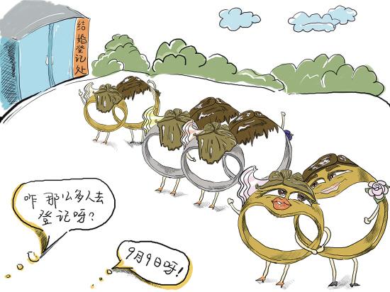 今天是2009年9月9日,成為眾多年輕人喜定終身大事的好日子。不少年輕男女選在今天去登記結婚,有的選在今天大擺喜宴……他們看中的是這個日子里蘊含的百年一遇的“久久久”好彩頭。民俗專家解釋說,2009年9月9日,因諧音讀起來像“愛你久久久”,吸引了許多年輕人選擇在今天喜結良緣,祈求婚姻長久。這一現象源于古人對數字的崇拜,現在人們利用漢字之間的諧音,以祈福表達良好祝福。