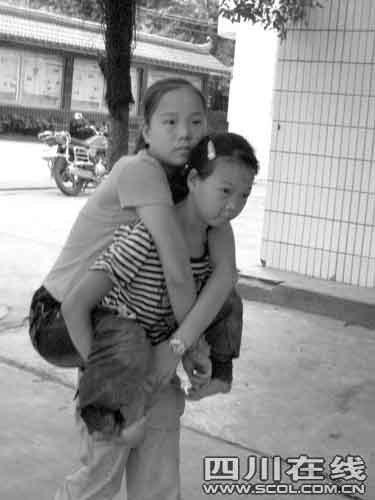 昨日上午第三節(jié)課下課鈴聲一響,初三一班的王琴就趕緊跑出教室,來到初三三班教室,走到姐姐王利面前:“姐,走,我背你上廁所。”其他同學(xué)主動(dòng)騰開位置,只見瘦小的王琴蹲下半個(gè)身子,微胖的姐姐王利努力將雙手放在妹妹的雙肩上,妹妹用雙手托起姐姐的兩只大腿,然后甩開了大步。