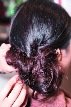 Step2將兩側的頭發向外卷曲,將兩側頭發向后扭,夾在馬尾之上,用發夾固定。