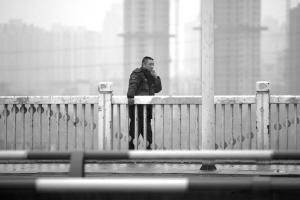 男子站在大橋護(hù)欄外抽著煙