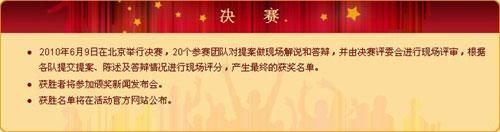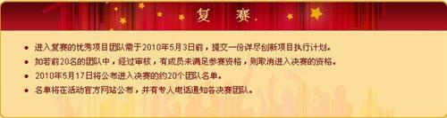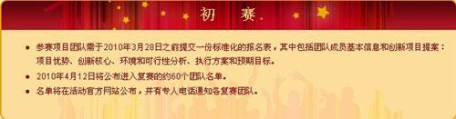 參賽項目團隊需于2010年3月28日之前提交一份標準化的報名表,其中包括團隊成員基本信息和創新項目提案:項目優勢、創新核心、環境和可行性分析、執行方案和預期目標。