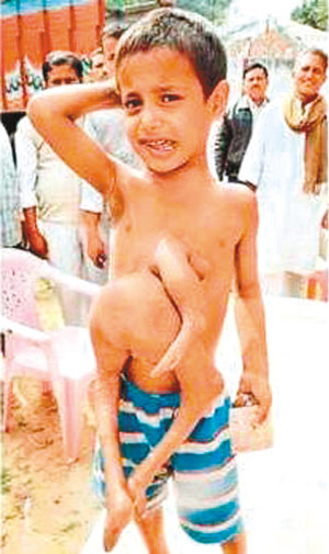 據(jù)德國(guó)《圖片報(bào)》2月19日?qǐng)?bào)道,現(xiàn)年8歲的迪帕克·庫(kù)馬爾是一名來(lái)自印度比哈爾邦的小男孩。從一出生,他的外貌就把周?chē)娜梭@得目瞪口呆:他長(zhǎng)著4條腿和3支手臂,在他腹中有個(gè)孿生弟弟和他一起來(lái)到這個(gè)世界上。