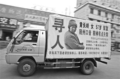 海報(bào)3米多長,1米多高,占據(jù)了整個貨柜車車廂的側(cè)面。海報(bào)上寫著黃底紅字“尋人”,印著一名中年女子的照片。兒子李曉峰介紹,母親名叫黃長嶺,57歲,短發(fā),隨州口音,走失時穿紅色棉襖,黑色褲子,腳穿黑色皮棉鞋。