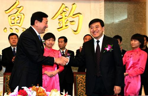 阜新市市長潘利國(前排左)和伊利集團(tuán)董事長潘剛(前排右)出席并簽署協(xié)議。
