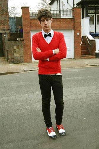 著裝智慧:①紅色拼接牛津鞋與紅色針織衫的呼應。②黑色小領結的運用。