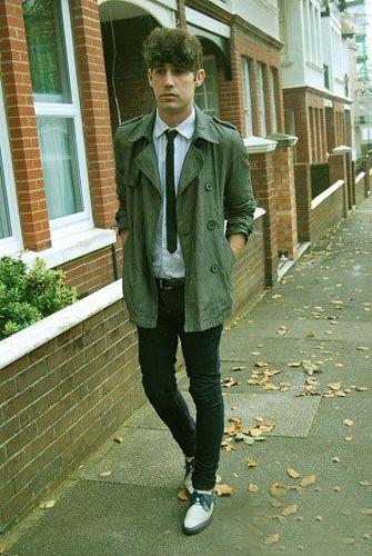1.軍綠色風衣 topman 2.白色襯衫 ZARA 3.窄領帶 H&M 4.黑色瘦腿褲 topman 5.黑白復古鞋