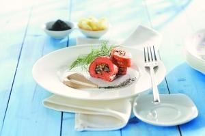 1.將鮮三文魚柳去皮,摘出魚刺和切去多余脂肪,用刀從魚柳中間向左右兩邊片開,但不要完全切斷,然后在三文魚上蓋上保鮮膜,用拍肉板輕輕地將魚肉拍成0.5cm薄片,再撒上檸檬皮碎、鮮蒔蘿碎、鹽(3g)和白胡椒粉(3g)調味。