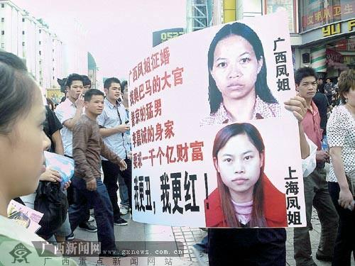 “找奧巴馬的大官、普京的猛男、李嘉誠的身價、要求一千個億財富……”4月11日下午,一男子在南寧市裕豐商廈門前,舉出“廣西鳳姐征婚”的廣告牌,聲稱要為自己的一位親戚——“廣西版鳳姐”征婚。當天在現場,所謂的“廣西鳳姐”故作神秘沒現身,但其開出的征婚條件卻“雷倒”了眾多圍觀市民。這也引起了一些好奇市民的猜想和質疑:“廣西鳳姐”是不是想學新近的“網絡紅人”——羅玉鳳(“鳳姐”)來出名?