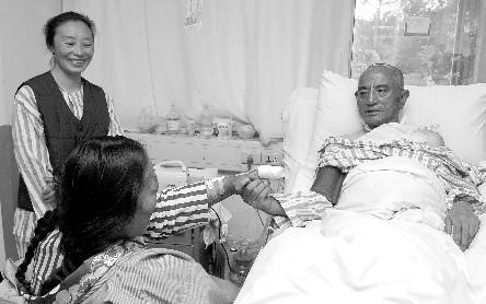 看到日夜擔心的丈夫,卓瑪的眼淚止不住地流下來。根德緊緊抓住妻子的左手,用手勢告訴卓瑪,他不能說,但能走,讓妻子不要擔心。當得知妻子的右眼很可能失明時,他臉上的笑容瞬間凝固了。他輕輕地撫摸著妻子的右臉,根德雙眼潮紅:“要堅強,你要好好養病。”根德比劃著手勢,他把妻子的手握得更緊。