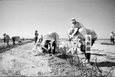 此次活動的主要任務是植沙障。原來,當地防治沙化主要是種植了一種叫做堿蓬的植物,為了防止大風吹走堿蓬的種子,就將折斷的枯樹枝一排排整齊地插在土里,也就是沙障了。