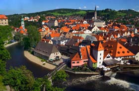 克魯姆洛夫距離首都布拉格160公里,1992年被聯(lián)合國(guó)教科文組織列為世界文化遺產(chǎn)。從布拉格搭乘巴士,三個(gè)小時(shí)就到了。下了車,看著眼前的柏油公路和飛馳而過(guò)的汽車,茫然不知如何把眼前的城市景觀和傳說(shuō)中的童話小鎮(zhèn)聯(lián)系上。跟隨著同車的兩三個(gè)背包客,跨過(guò)一座橋到了公路對(duì)面,瞬時(shí)眼前出現(xiàn)了一座暗紅色的磚砌拱門,右前方水聲潺潺,郁郁蔥蔥的樹(shù)木后可見(jiàn)一座頗具童話特征的彩繪圓形塔。這一切告訴我,這扇拱門就是通往童話小鎮(zhèn)的入口了。